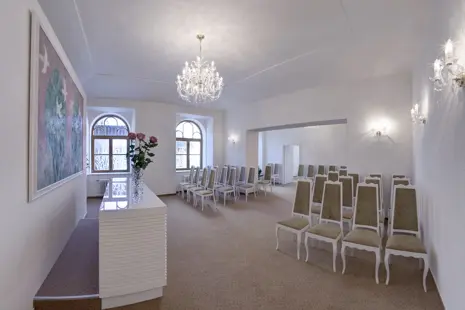 Do obřadní síně radnice v Semilech jsme dodali nové křišťálové osvětlení z naší nové produktové řady. Hlavní sál osvětluje křišťálový lustr se žárovkami ve dvou řadách nad sebou a pět nástěnných svítidel. V předsálí jsou umístěny dva stejné modely ze stejné produktové řady, takže celé osvětlení těchto prostor působí uceleným dojmem.