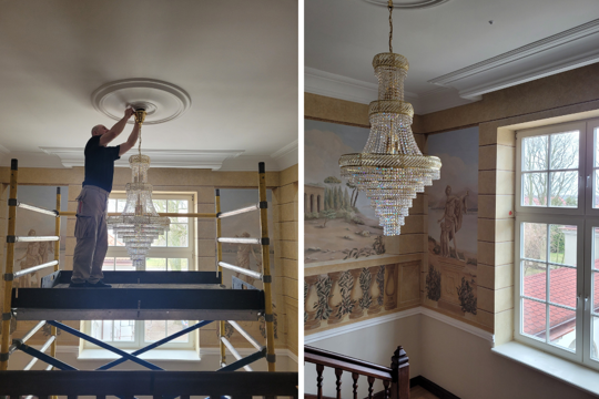 Nově zrekonstruovaná městská vila v Polsku byla kompletně vybavena lustry od naší firmy. Byl použit téměř celý sortiment našich svítidel. V každé místnosti byl použit jiný typ lustru. Od klasických křišťálových lustrů, přes odlitkové lustry až po stropní svítidla z drobných krystalků. Dominantou domu se stal lustr nad hlavním schodištěm domu, který osvětluje malby podél celého schodiště.