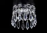 Po obvodu svítidla jsou zavěšeny broušené křišťálové ověsy ve tvaru špičatých kapek (dropsů). Každý paprsek denního i umělého světla se v nich láme do jemných barevných odlesků, které dodají prostoru hloubku, třpyt a eleganci. Nejde o efekt navíc – jde o atmosféru, kterou cítíte pokaždé, když vstoupíte do místnosti.