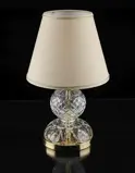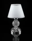 Malá stolní lampa má nohu sestavenou z dílů z olovnatého křišťálu s ochrannou známkou BOHEMIA CZECH REPUBLIC – LEAD CRYSTAL OVER 24% PbO. Bílé textilní stínítko je ozdobeno dvěma textilními pásky s kovovým třpytem. Svítidlo je vhodné do obýváku i do ložnice.
